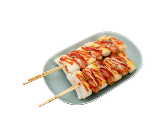 맛있는 양념에 구운 소시지와 떡이 꽂혀져 있는